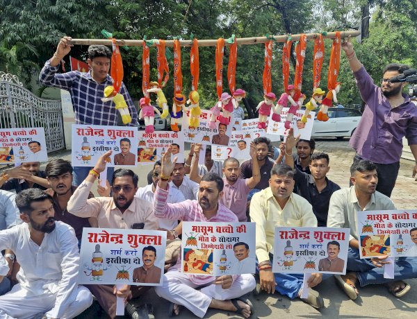 मध्य प्रदेश कांग्रेस के प्रवक्ता विवेक त्रिपाठी के नेतृत्व में कांग्रेस और NSUI कार्यकर्ताओं ने रविवार को भोपाल में जोरदार विरोध प्रदर्शन किया। प्रदर्शन के दौरान 12 खिलौनों के बच्चों को बीजेपी के गमछे से फांसी लगाते हुए प्रतीकात्मक रूप से सरकार की संवेदनहीनता और प्रशासनिक हत्या को दर्शाया गया।