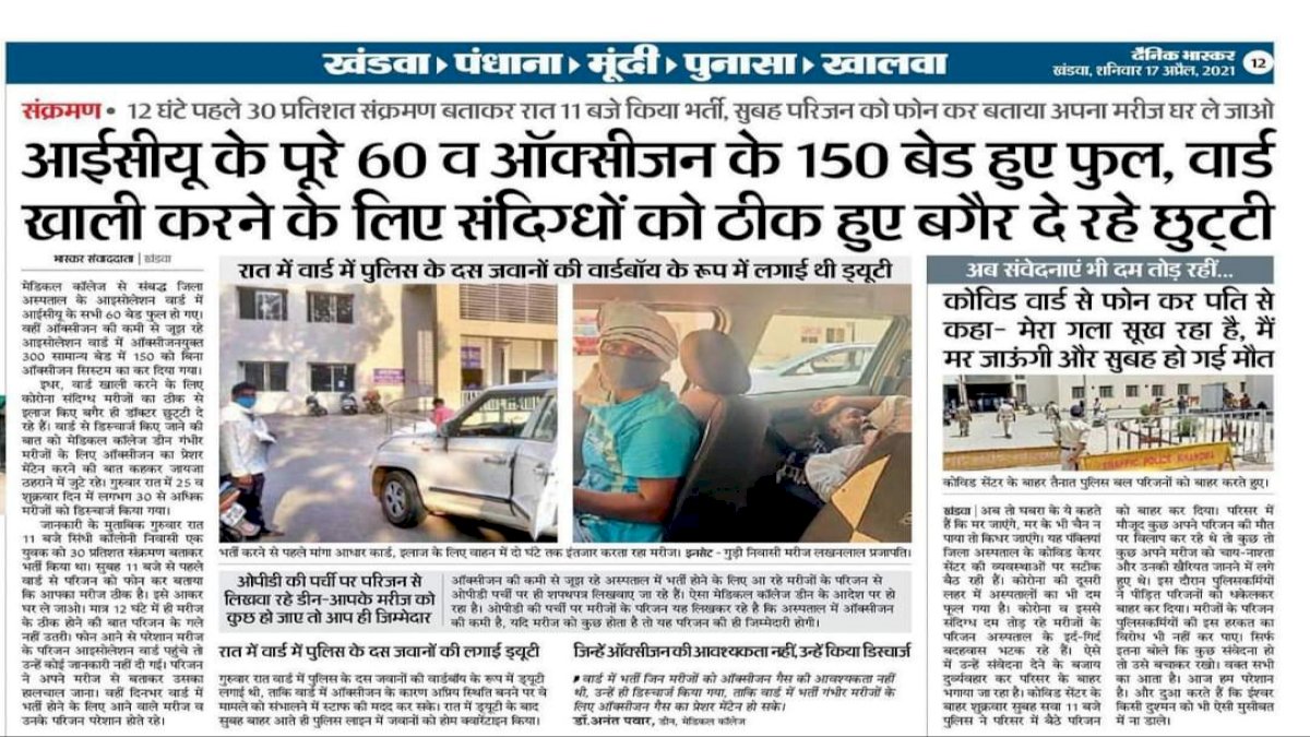 इतना ही नहीं अखबार ने विस्तृत रूप से यह भी बताया गया था कि ऑक्सीजन की कमी को हैंडल करने के लिए प्रशासन ने क्या व्यवस्था की है। खंडवा भास्कर के मुताबिक अस्पताल में रातभर के लिए 10 पुलिस के जवानों को ड्यूटी पर भेजा गया था ताकि ऑक्सीजन के लिए तड़पते मरीज अस्पताल में कोई बवाल न करें। इस तरह के अप्रिय स्थिति से निपटने के लिए अस्पताल में पुलिस लगा दिए गए थे। इतना ही नहीं पुलिस के द्वारा पीड़ितों के परिजनों को धक्के मारकर भगाने की भी जानकारी दी गई थी।