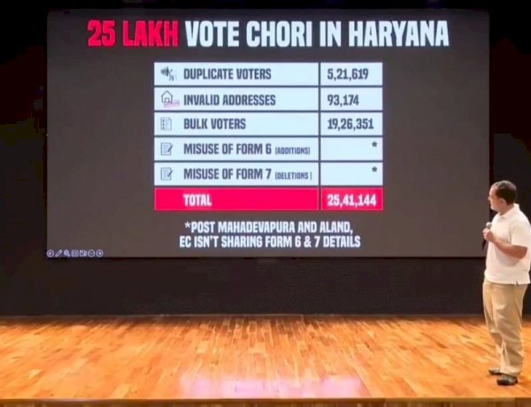 हरियाणा में पांच कैटेगरी में 25 लाख वोट चोरी हुई और 5 लाख 21 हजार से ज्यादा डुप्लीकेट वोटर मिले। हरियाणा में कुल दो करोड़ वोटर हैं। 25 लाख वोट चोरी का मतलब है कि हर आठ में से एक वोटर फेक था: राहुल गांधी
