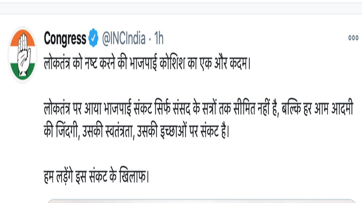 कांग्रेस ने सरकार के इस कदम को लोकतंत्र विरोधी बताया है। कांग्रेस पार्टी ने ट्विटर के जरिए प्रतिक्रिया जाहिर करते हुए कहा कि 'यह लोकतंत्र को नष्ट करने की भाजपाई कोशिश का एक और कदम है। लोकतंत्र पर आया भाजपाई संकट सिर्फ संसद के सत्रों तक सीमित नहीं है, बल्कि हर आम आदमी की जिंदगी, उसकी स्वतंत्रता, उसकी इच्छाओं पर संकट है। हम लड़ेंगे इस संकट के खिलाफ।"