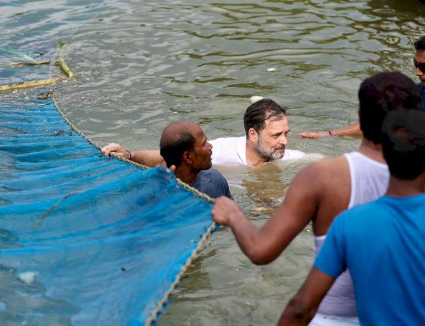 राहुल गांधी ने बेगूसराय में तालाब में लगाई छलांग, मछुआरों के साथ मिलकर जाल से मछलियां पकड़ीं